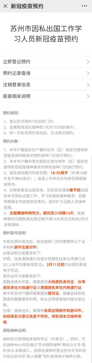 点击“疫苗接种”专区,进入“苏州市因私出国工作学习新冠疫苗预约”界面。