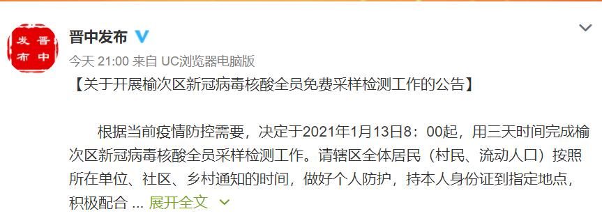 荔枝新闻讯 山西省晋中市榆次区新冠肺炎疫情防控办公室今晚发布公告,根据当前疫情防控需要,将于2021年1月13日8:00起,用三天时间完成榆次区新冠病毒核酸全员采样检测工作。请辖区全体居民(村民、流动人口)按照所在单位、社区、乡村通知的时间,做好个人防护,持本人身份证到指定地点,积极配合做好采样检测工作。