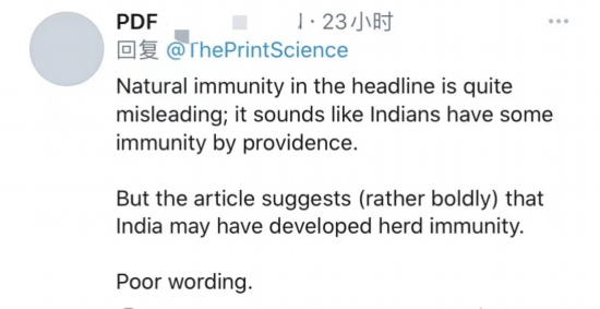 有网友在推特上留言说:“标题中的自然免疫十分误导人;听起来像是天意赋予印度人某种免疫力。但这篇文章(相当大胆地)暗示,印度可能已经发展出群体免疫力。用词不当。”↓