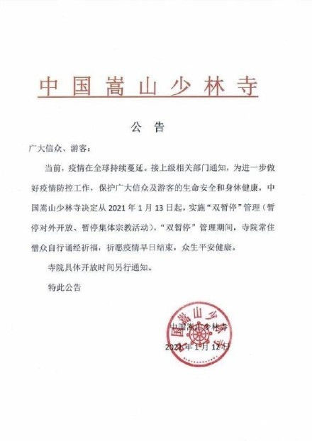 1月12日晚间,嵩山少林寺发布公告,自1月13日起,暂停对外开放、暂停集体宗教活动。 少林寺在公告中称,当前,疫情在全球持续蔓延,接上级相关部门通知,为进一步做好疫情防控工作,保护广大信众及游客的生命安全和身体健康,中国嵩山少林寺决定从2021年1月13日起,实施“双暂停”管理(暂停对外开放、暂停集体宗教活动)。“双暂停”管理期间,寺院常住僧众自行诵经祈福,祈愿疫情早日结束,众生平安健康。 寺院具体开放时间另行通知。