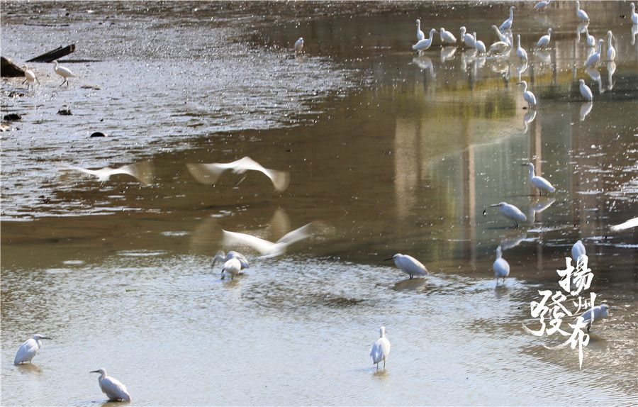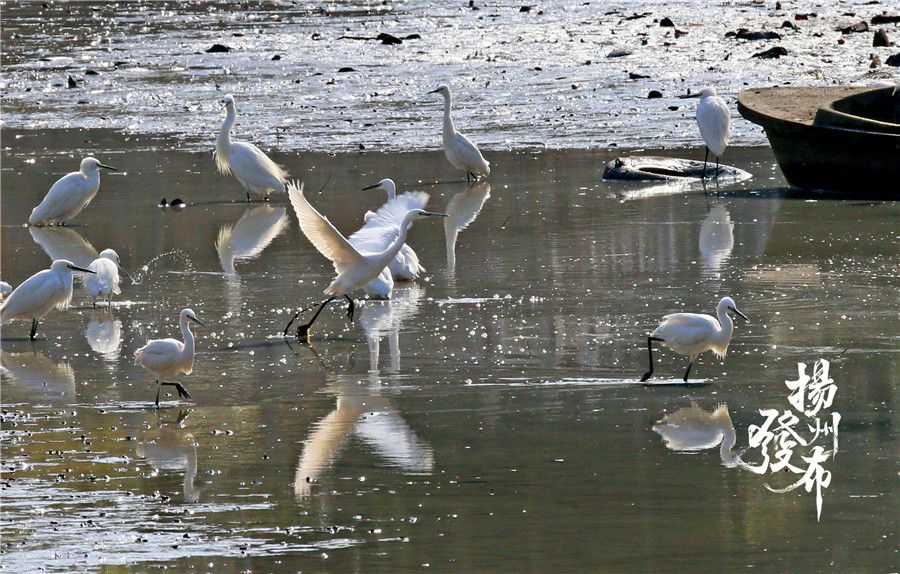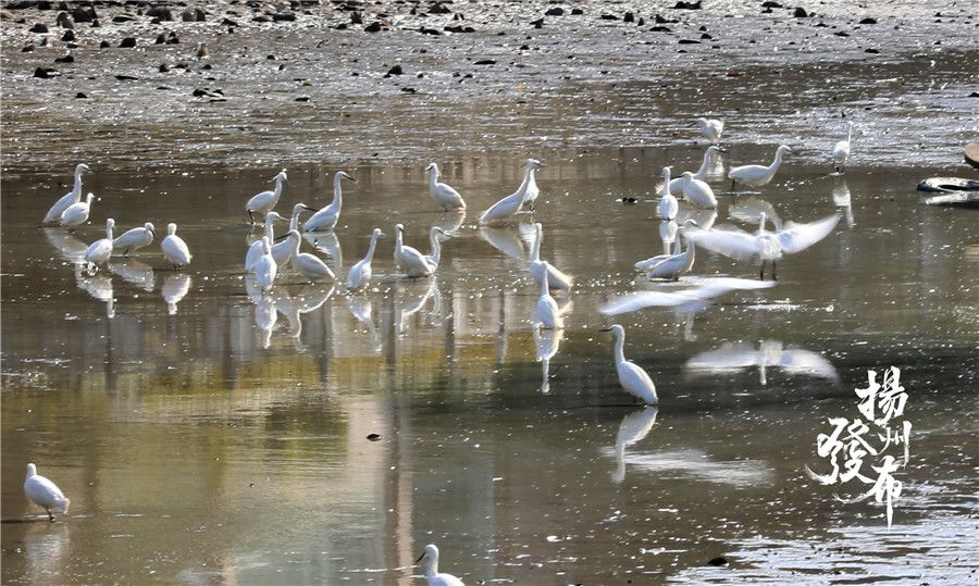 扬州瘦西湖清淤正在进行中。随着水位低落,许多候鸟不约而至。