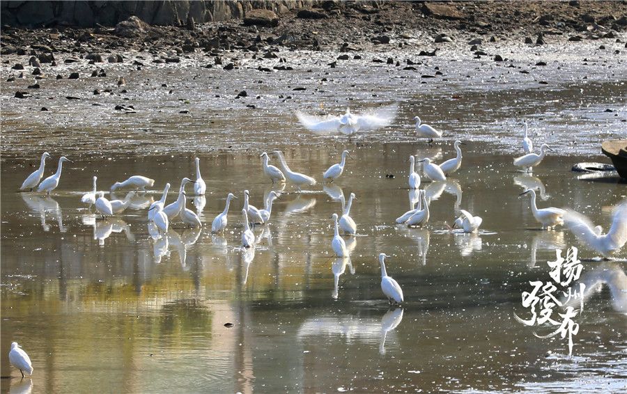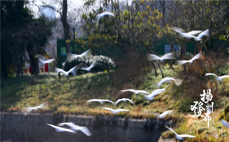 迎宾馆水域栖息了数十只夏候鸟小白鹭。它们正在刚刚干涸的水中觅食,忙得不亦乐乎。