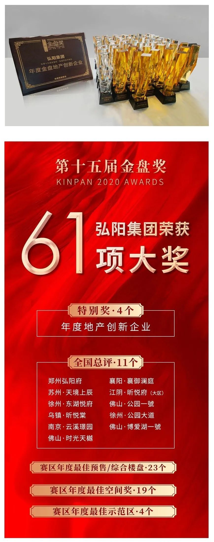 在第十五盘金盘奖评选中,弘阳地产从4668个申报项目中脱颖而出,获得61项大奖,名列地产开发商总排行榜第4名。
