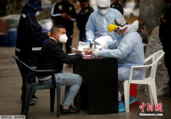 资料图:2020年8月22日晚,秘鲁警方对一家违反防疫规定经营的夜店采取取缔行动。图为被拘者在进行核酸检测。