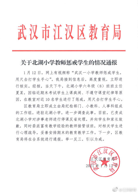 通报表示,武汉市江汉区教育局接到信息后,高度重视,立即进行核实。经核,当天下午,北湖小学六年级(8)班班主任夏某,因临近期末考试学生上课疯闹、不遵守课堂纪律等原因,在教室对近10名学生进行了惩戒,用尺击打学生手心。