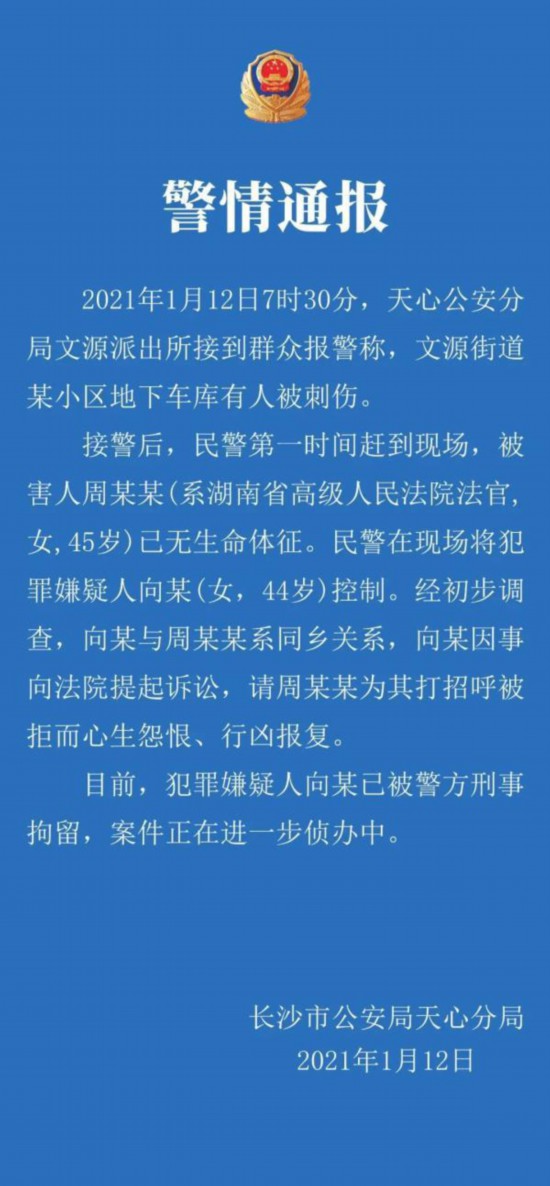 据湖南省长沙市公安局天心分局1月12日发布的警情通报,12日7点30分,天心公安分局文渊派出所接到群众报警,称文渊街道某小区地下车库有人被刺伤。民警赶到现场时,被害人周春梅已无生命体征,犯罪嫌疑人向某被警方控制。