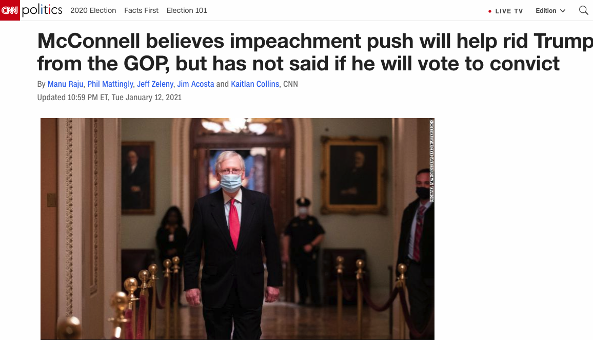 △参议院多数党领袖、共和党成员米奇·麦康奈尔在12日透露,弹劾能够帮助共和党将特朗普逐出党派。(图片来源:CNN)