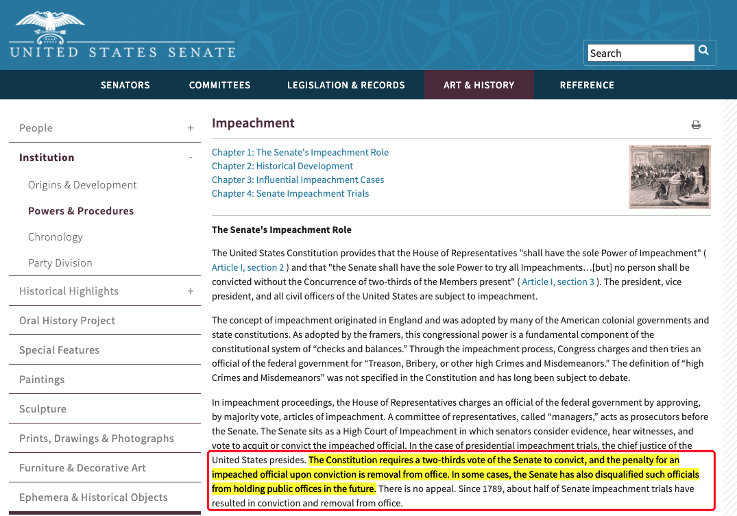 △据美国联邦宪法的相关解释,只有2/3的参议院议员投票支持弹劾,弹劾才能够最终生效。(图片来源:美国联邦政府参议院官网)