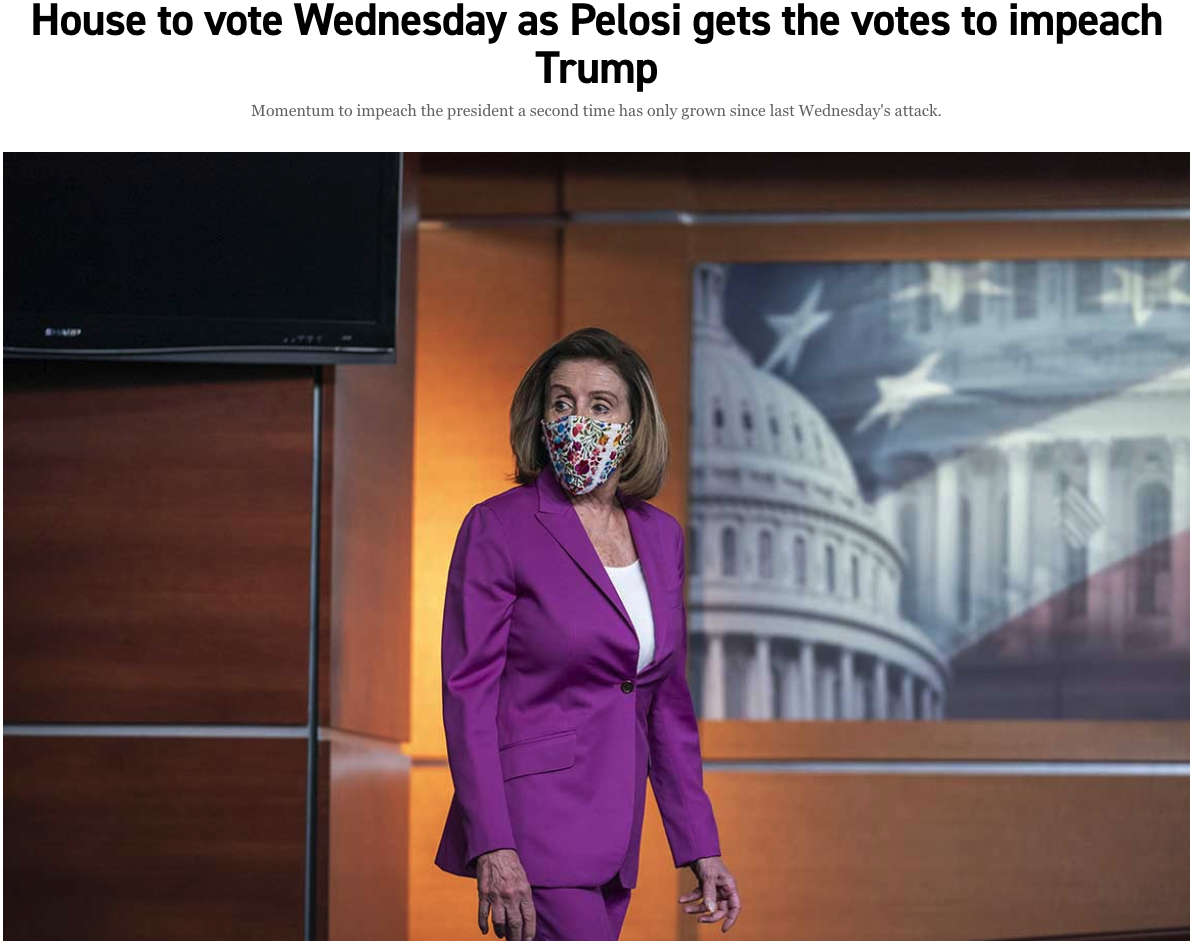 △在副总统彭斯于12日拒绝援引美国宪法第25条修正案弹劾特朗普后,佩洛西开始计划在13日发起由国会弹劾特朗普的议案。(图片来源:Politico)
