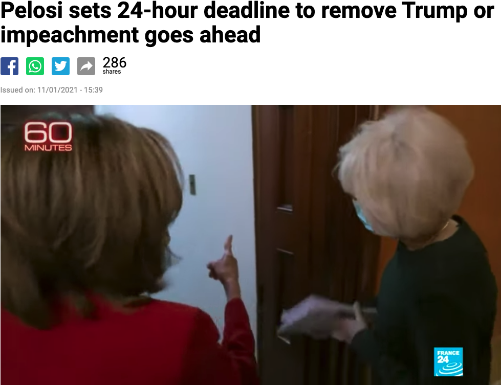 △法国24新闻台称,众议院多数党领袖、民主党成员佩洛西为弹劾特朗普设置了最后的24小时期限。(图片来源:法国24新闻台)