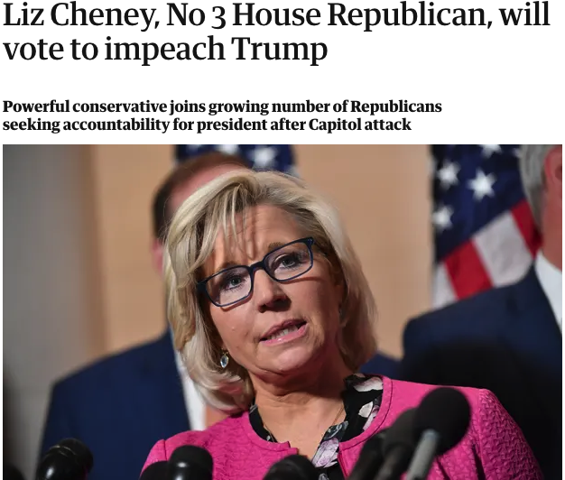 △众议院共和党会议主席丽兹·切尼12日表示,她将支持弹劾特朗普的提案。多家外媒将丽兹·切尼形容为“共和党第三号人物”。(图片来源:《卫报》)