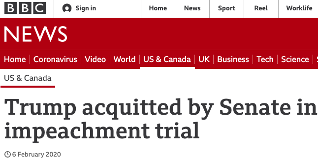 △2020年2月,共和党占多数的参议院以52票赞成对48票反对,否决了对特朗普的弹劾。(图片来源:BBC)