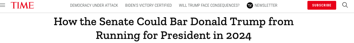 即便弹劾没有在1月20日完成,但是只要弹劾议案最后在参议院达到2/3的支持或针对特朗普“煽动叛乱”的罪名成立,民主党还可以提议禁止特朗普再次担任公职,从而剥夺特朗普在2024年再次竞选美国总统的机会。而针对禁止担任公职的投票,只需要简单多数票即可获得通过。