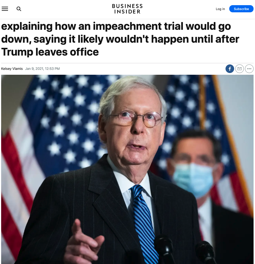 △参议院多数党领袖、共和党成员米奇·麦康奈尔在9日称,由于参议院一直处于休会状态,很可能不会在19日复会之前召开关于弹劾特朗普的议案。(图片来源:Business Insider)