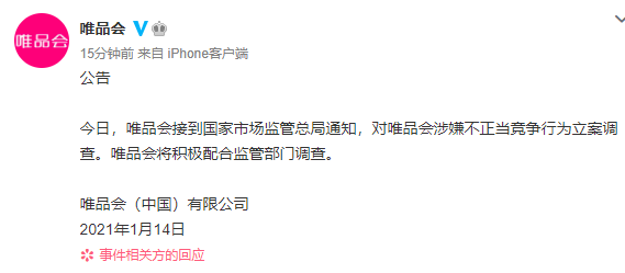 荔枝新闻讯 唯品会刚刚在微博上发布公告,称将积极配合监管部门调查。