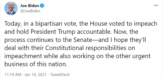 “今天,在两党的投票中,众议院投票赞成弹劾并要求总统特朗普(为“煽动叛乱”)负责。现在,参议院将继续这项程序。我希望他们尽到在弹劾事务上的宪法责任,同时也要处理国家的其他紧急事务。”拜登在推特上写道。