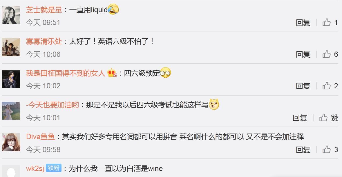 值得一提的是,微博话题#中国白酒英文名改了#14日登上了热搜榜,“四六级考生”变身喜大普奔的群体,不少网友直呼“太好了!英语六级不怕了!”。
