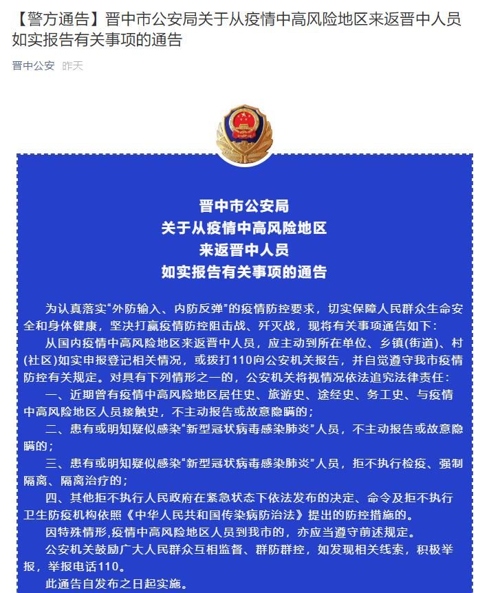 荔枝新闻讯 据“晋中公安”微信号消息,山西晋中市公安局1月13日发布通告,为认真落实“外防输入、内防反弹”的防控要求,即日起,从疫情中高风险地区来返晋中人员,应主动到所在单位、乡镇(街道)、村(社区)如实申报登记相关情况,或拨打110向公安机关报告,并自觉遵守当地疫情防控有关规定。如有以下四类情况,公安机关将视情况依法追究法律责任: