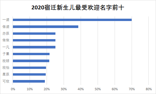 根据宿迁市公安局提供的数据,2020年宿迁共有5.3万名新生儿落户,其中叫“一诺”的最多,有376名。同音不同字的“依诺”也有205名。此外,“亦辰”,“子墨”,“欣怡”等也是热门名字,各有100多名。