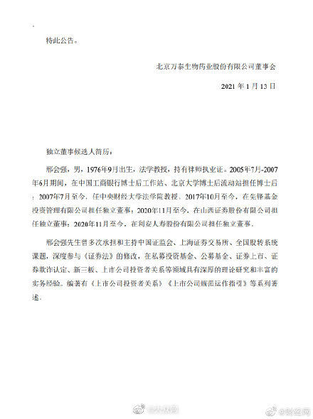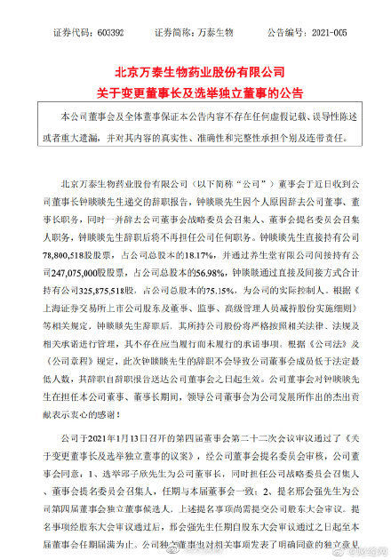 北京万泰生物药业股份有限公司13日晚发布公告称,钟睒睒因个人原因辞去公司董事、董事长职务,同时辞去公司董事会战略委员会召集人、董事会提名委员会召集人职务。钟睒睒现任农夫山泉董事长,持股比例高达84.41%。2020年11月,被称为“水中茅台”的农夫山泉股价刷新高,钟睒睒因持股农夫山泉及万泰生物两家上市公司控股权,身价一举超越马云、马化腾成中国首富。