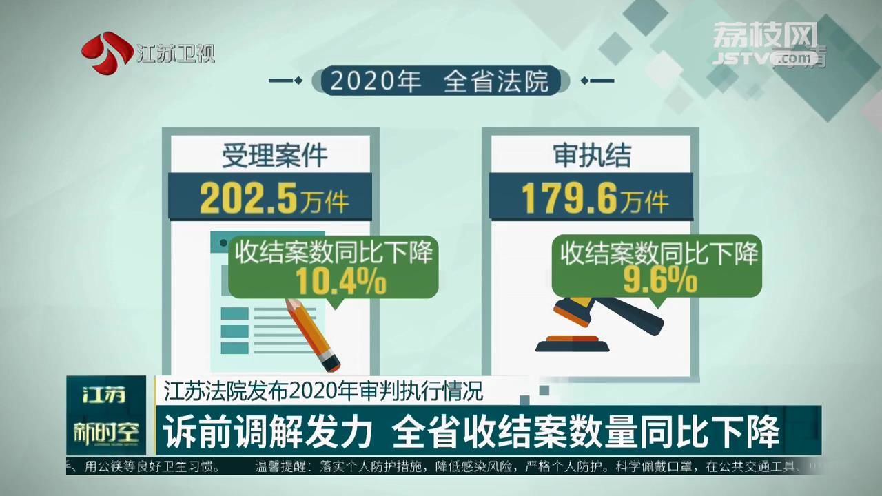 2020年,全省法院受理案件202.5万件,审执结179.6万件,收结案数同比分别下降10.4%、9.6%。审判执行工作总体呈现结案率和结收案比明显提升、未结案件大幅减少的良好态势。