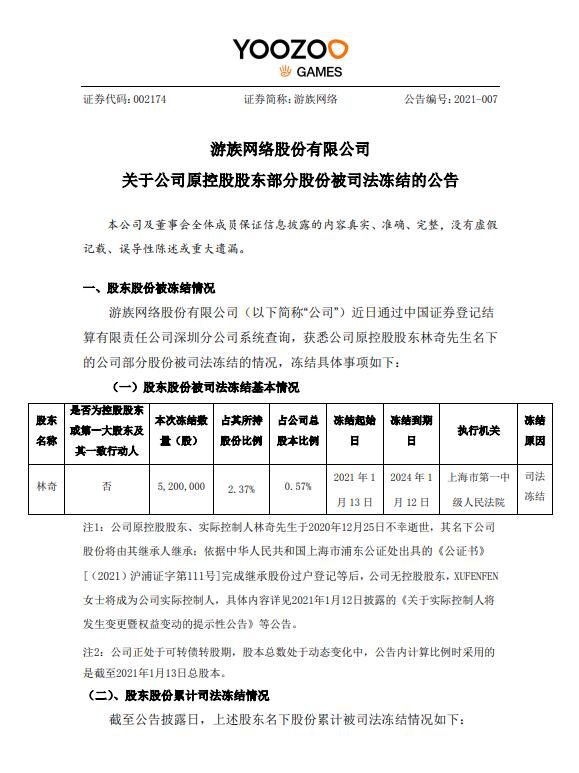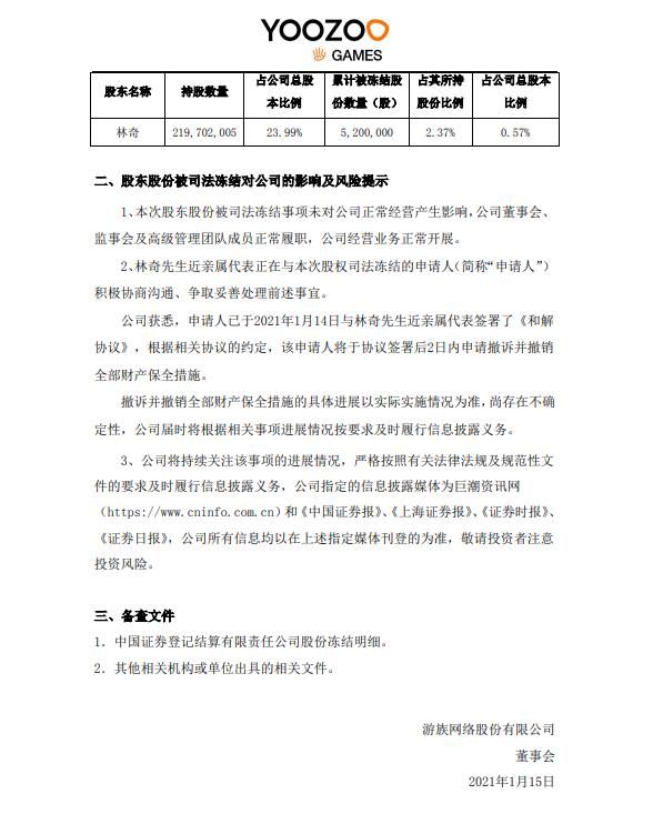 原控股股东林奇名下的520万股公司股份被上海市第一中级人民法院司法冻结,占其所持股份比例为2.37%,占公司总股本比例为0.57%。游族网络1月14日收报12.85元,以此计算,本次被司法冻结的股份总价值约6682万元。