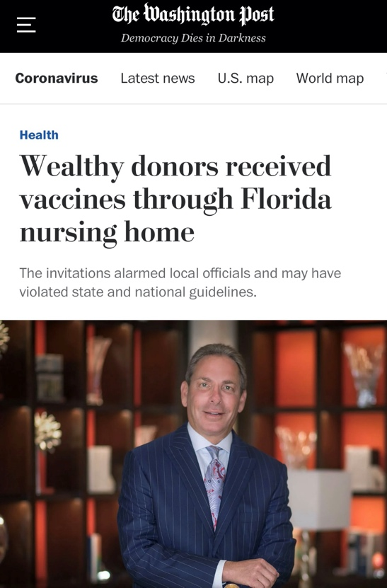 △《华盛顿邮报》指出,佛罗里达州老年护理中心的富有投资人抢先得到了疫苗接种