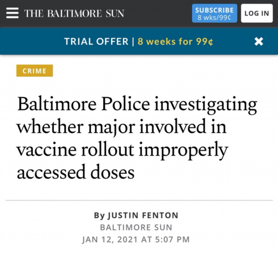 △《巴尔的摩太阳报》报道:当地警察利用职权之便获得疫苗接种
