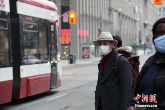 当地时间1月14日,佩戴口罩的乘客在加拿大多伦多市中心等候公交车。多伦多所在的加拿大人口第一大省安大略省从当天开始实施“居家令”。 中新社记者 余瑞冬 摄