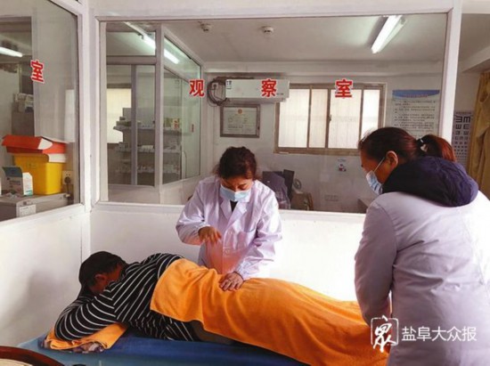 △亭湖区慈悦托福中心(养老院)护理区医生给院里老人中医按摩。