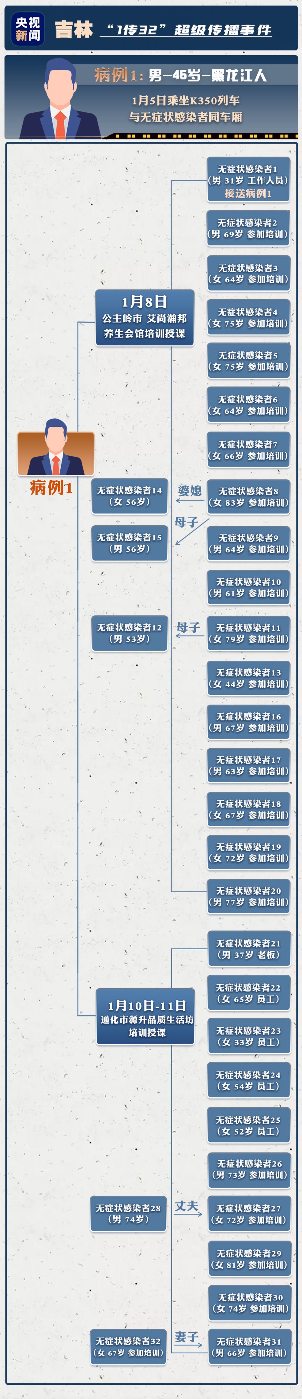 据官方通报,目前,该病例已导致吉林省3市32人感染,分布在通化市(12例)、公主岭市(19例)、松原市(1例)。