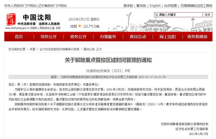 按照国务院联防联控机制《关于调整新冠肺炎疫情分区分级标准实施精准管控措施的通知》(国电发〔2020〕11号)要求和沈阳市新冠疫情防控专家组综合评估研判意见,经沈阳市指挥部研究决定,从即日起,上述重点管控区域解除封闭并撤销相应管控措施。