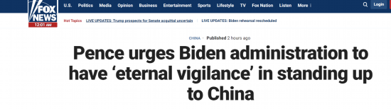 福克斯新闻说,彭斯敦促拜登政府,在面对中国时要“永远保持警惕”。彭斯说:“在新一届美国政府准备就职之际,我们作为美国人应该记住,自由的代价就是永远保持警惕。”