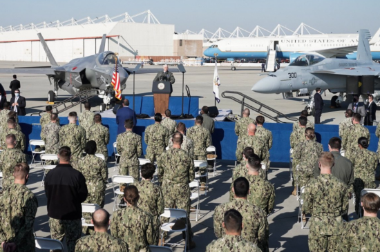彭斯在勒莫尔海军航空基地讲话。图源:美媒