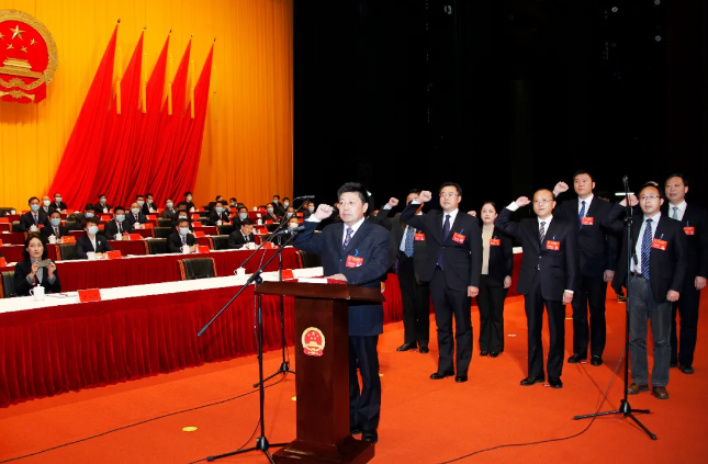 在肖进方的领誓下,薛国骏等新当选人员庄严向宪法宣誓,表示将忠于宪法,维护宪法权威,履行法定职责,忠于祖国,忠于人民。