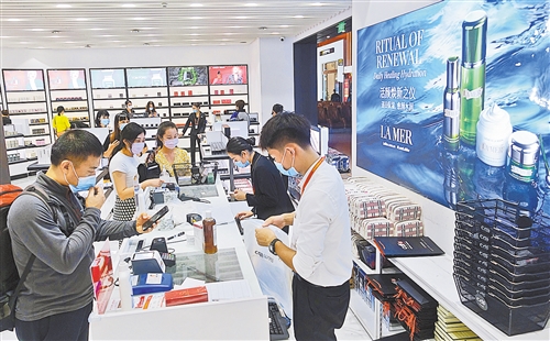 海南三家离岛免税店日前正式开业,海南国际旅游消费中心再度升级。图为消费者在中免集团三亚凤凰机场免税店选购商品。 新华社记者 赵颖全摄