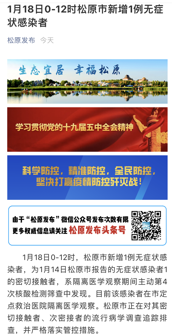 荔枝新闻讯 据“松原发布”消息,今天0—12时,吉林省松原市新增1例无症状感染者,为1月14日松原市报告的无症状感染者1的密切接触者,系隔离医学观察期间主动第4次核酸检测筛查中发现。目前该感染者在市定点救治医院隔离医学观察。松原市正在对其密切接触者、次密接者的流行病学调查追踪排查,并严格落实管控措施。