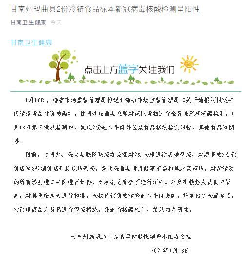 荔枝新闻讯 甘肃省甘南藏族自治州卫生健康委员会微信公众号“甘南卫生健康”今日发布“甘南州玛曲县2份冷链食品标本新冠病毒核酸检测呈阳性”消息称:1月16日,接甘肃省市场监督管理局推送青海省市场监督管理局《关于通报阿根廷牛肉涉疫货品情况的函》,甘南州玛曲县立即对该批货物进行全覆盖采样核酸检测,在18日第三批次检测中,发现2份进口牛肉外包装样品核酸检测呈阳性,其他样品为阴性。