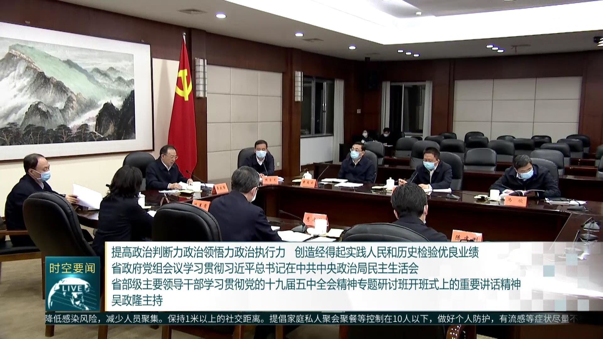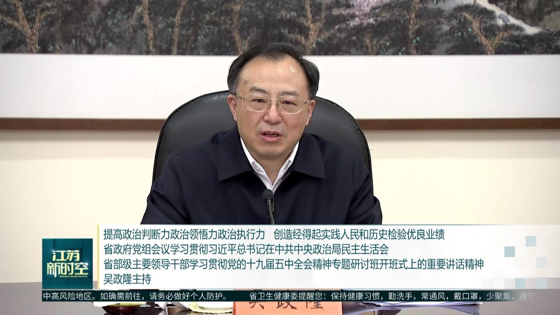 1月18日,省政府党组书记、省长吴政隆主持召开省政府党组会议,深入学习贯彻习近平总书记在中共中央政治局民主生活会、省部级主要领导干部学习贯彻党的十九届五中全会精神专题研讨班开班式上的重要讲话精神,认真学习贯彻习近平总书记近期重要讲话、重要指示和重要文章,按照党中央和省委部署,围绕提高政治判断力、政治领悟力、政治执行力,围绕准确把握新发展阶段、深入贯彻新发展理念、加快构建新发展格局,研究政府系统贯彻落实工作,切实担负起“争当表率、争做示范、走在前列”重大使命,努力创造经得起实践、人民和历史检验的优良业绩。