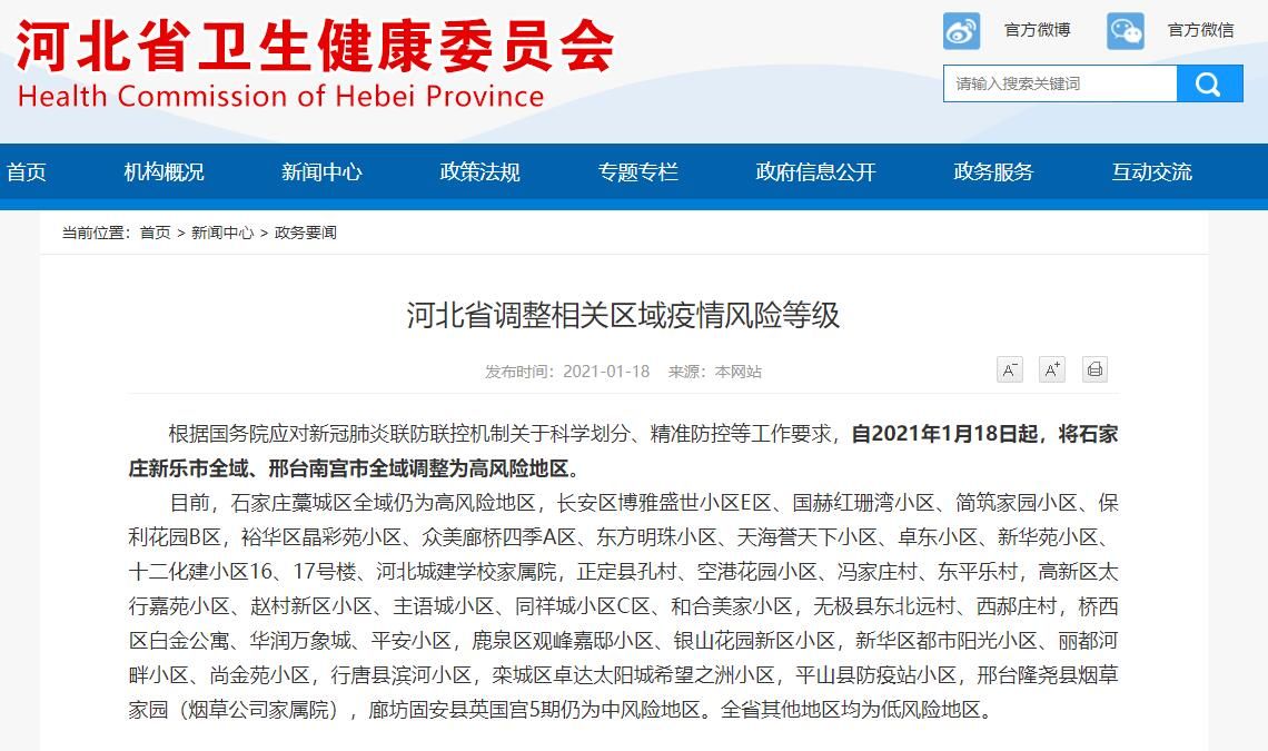荔枝新闻讯 据河北省卫健委消息,根据国务院应对新冠肺炎联防联控机制关于科学划分、精准防控等工作要求,自2021年1月18日起,将石家庄新乐市全域、邢台南宫市全域调整为高风险地区。