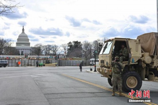 资料图:图为1月18日在国会大厦外执勤的国民警卫队员。中新社记者 陈孟统 摄