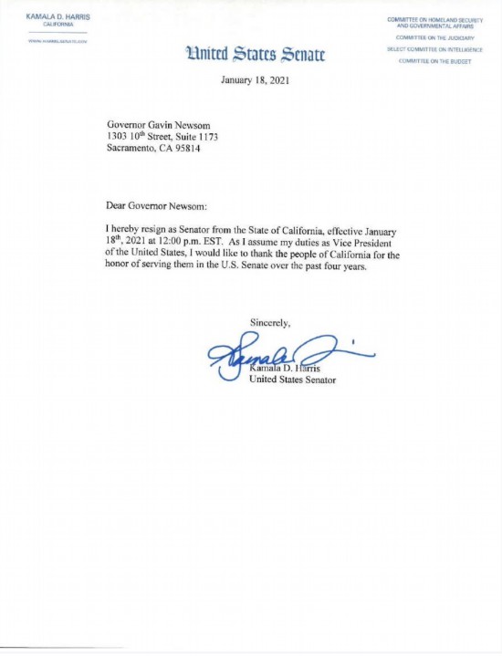 报道称,哈里斯已经将辞职信提交给加州州长加文·纽瑟姆,后者选择了加州州务卿亚历克斯·帕迪利亚接替哈里斯。《国会山报》表示,此举令帕迪利亚成为加州历史上首位拉美裔联邦参议员。哈里斯在信中写道:“我在此辞去我加利福纳尼亚州联邦参议员职务,从美国东部时间2021年1月18日24时起生效。我(即将)就任美国副总统一职,我想感谢所有加利福尼亚州人民,过去四年中在参议院为你们服务是一项荣耀。”
