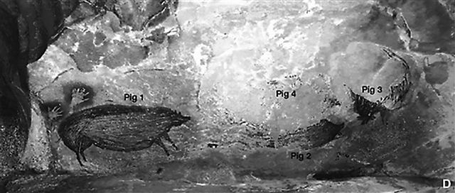 壁画上的3头猪中每一头都长1米多,由红色颜料绘制而成。经鉴定可能是苏拉威西岛疣猪,这种短腿野猪为该地特有,独特的面部疣也是该物种的一大特色。布鲁姆等人发现,从新发现的壁画上收集的矿物至少有45500年的历史。这意味着最早的现代洞穴艺术并非产生于冰河世纪的欧洲,而起源于更早的时代。