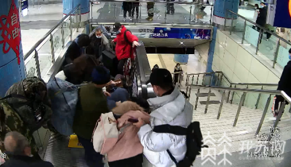 去年12月31日下午2点多,在南京地铁一号线南京站一个上行的换乘电梯上,一名女乘客拖着大件行李没站稳,摔倒在电梯上,由于将出口堵住了,后面的乘客来不及躲闪,五六人接连被带倒。直到工作人员赶到,按下了紧急停止按钮,后面的乘客才没有再遭殃。