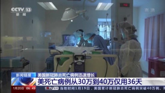 进入2021年,美国累计新冠肺炎死亡病例数快速攀升,当地时间1月2日,美国累计新冠肺炎死亡病例超过35万例,从30万升至35万用了19天。1月19日,这一数字超过40万,死亡病例从35万例升至40万例仅用了17天。美国新冠肺炎死亡人数从30万增加到40万只用了36天。在这36天里,美国平均每分钟就有两人死于新冠肺炎。