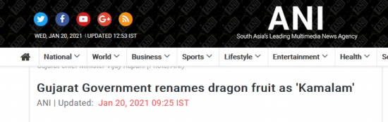 【环球网报道】火龙果要被改名了?印度亚洲新闻国际通讯社(ANI)20日报道称,印度西部古吉拉特邦地方政府决定重新命名“火龙果(dragon fruit)”为“Kamalam”。而根据该邦首席部长的说法,改名原因与中国有关。