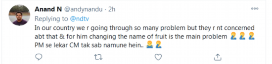 “在我们的国家,我们正在经历着很多问题,但是他们(地方政府)没有关心这些(问题),对于(地方政府来说),最主要的问题是重新命名水果”