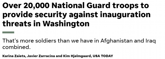 “在一些美国游客看来,这种安全既令人安心但又毛骨悚然。”今日美国报道称,随着总统就职典礼的临近,华盛顿市中心挤满了军队和执法人员。