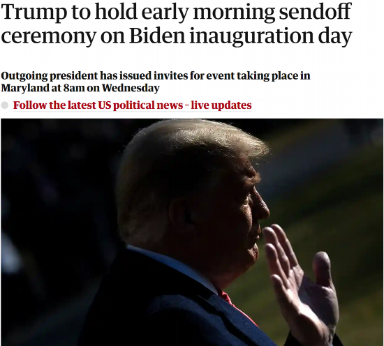值得注意的是,就在拜登举行就职典礼之时,特朗普还有意举办“卸任典礼”。英国《卫报》18日报道称,他计划在20日上午就职典礼开始前离开白宫,到停放“空军一号”总统专机的马里兰州安德鲁斯联合基地举行盛大的告别仪式。