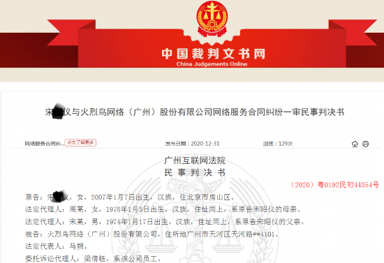2020年12月31日,中国裁判文书网公示了《宋某仪与火烈鸟网络(广州)股份有限公司网络服务合同纠纷一审民事判决书》((2020)粤0192民初44354号),裁定书详细披露了本案的相关细节。